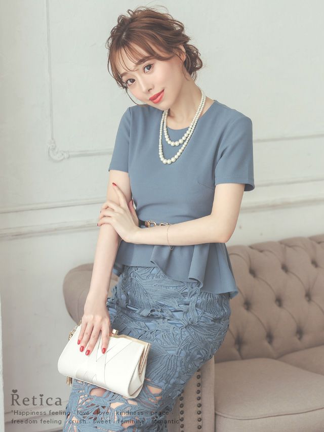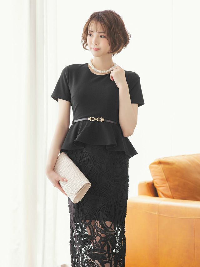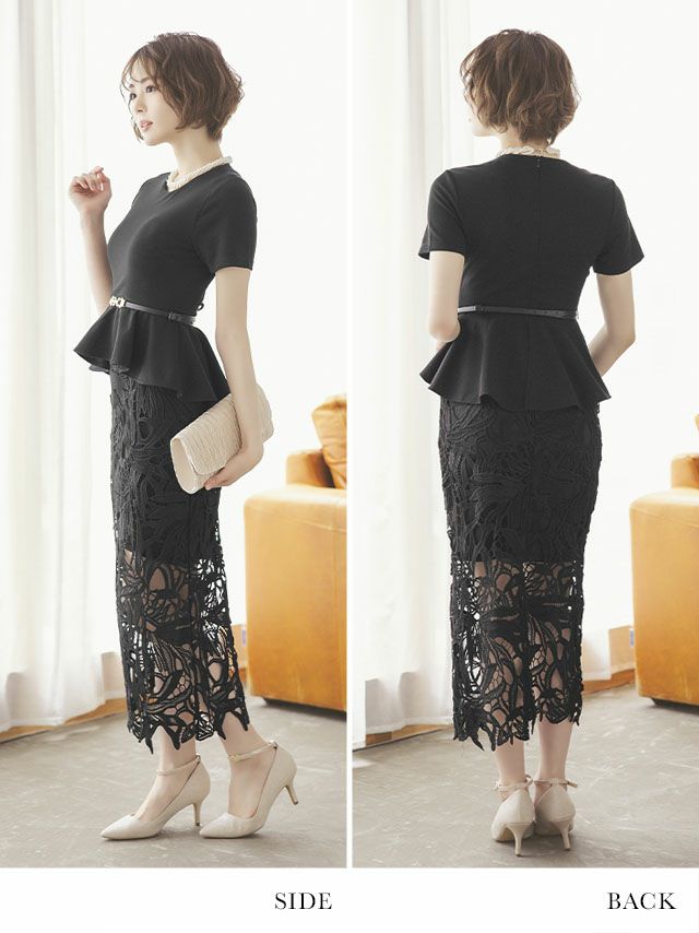 パーティー お呼ばれ 結婚式 ドレス パーティードレス お呼ばれドレス 結婚式ドレス ペプラム 半袖 袖ありドレス ベルト付き ケミカルレース myMinette マイミネット 2点setペプラムデザイン ロングレース結婚式パーティードレス