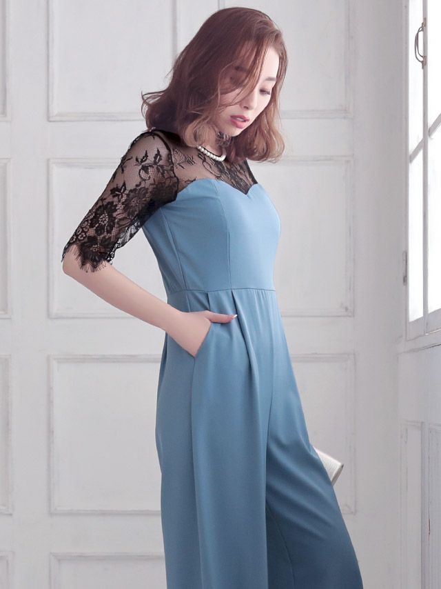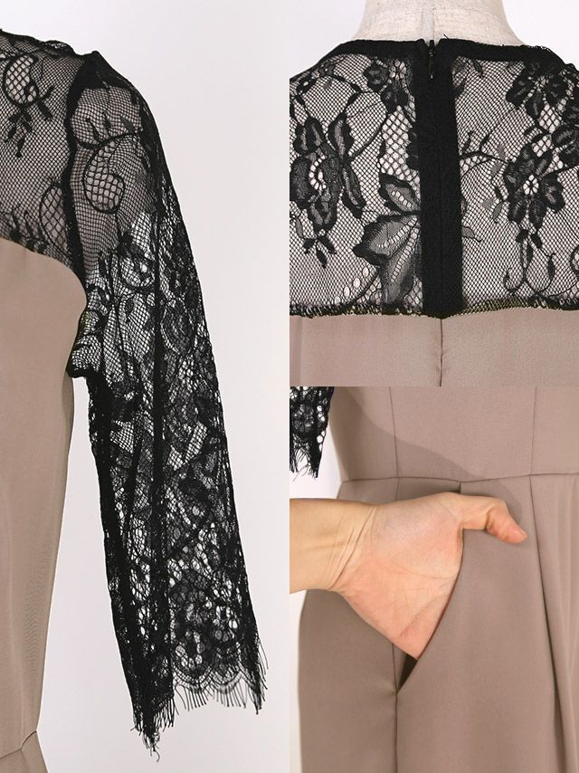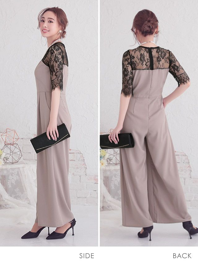 スカラップフラワー肌見せ大人レーススリーブフレア結婚式パーティーパンツドレス