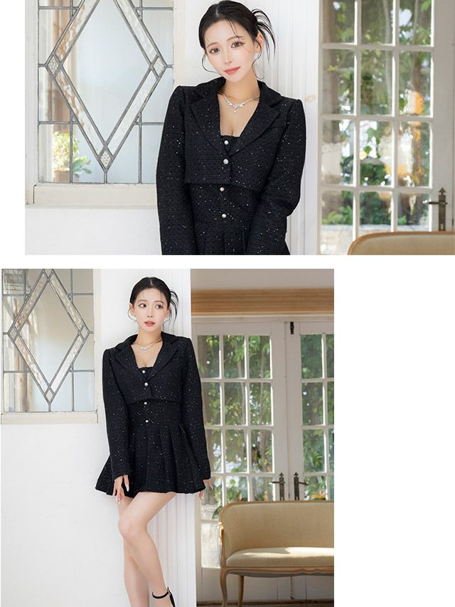 ショート丈ジャケットで脚長効果♪ ショートテーラードジャケット×フロントボタンプリーツフレアミニワンピースツイードセットアップスーツ (Sサイズ/Mサイズ) (せいせい/キャバスーツ着用) [Tika/ティカ]