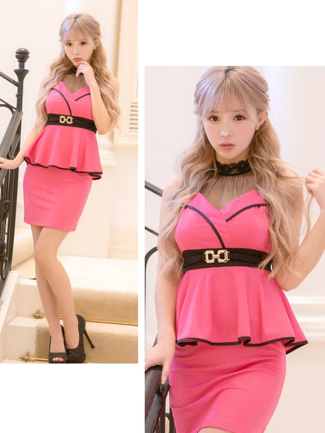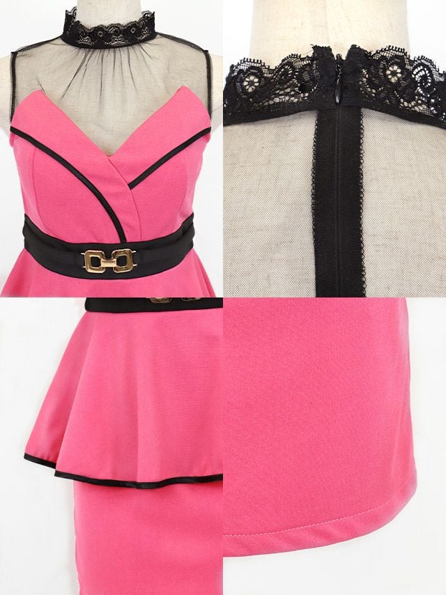 キャバドレス 安い 激安 ミニ丈 キャバクラ クラブ ラウンジ ノースリーブ デコルテ シアー ウエストベルト ペプラム パイピング タイト ミニ ドレス プチプラドレス