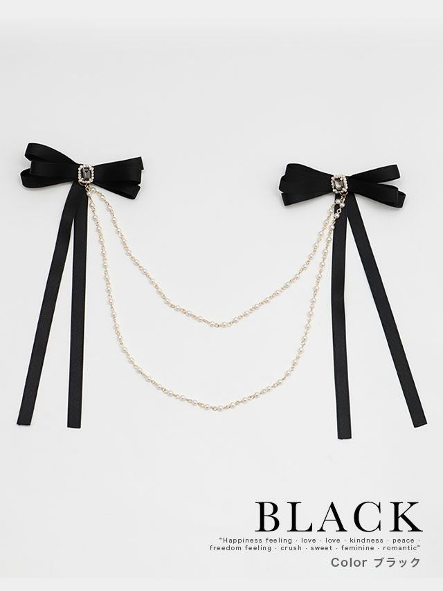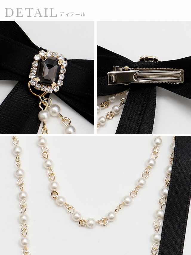 2連パールビジュー付きリボンバレッタヘアアクセサリー
