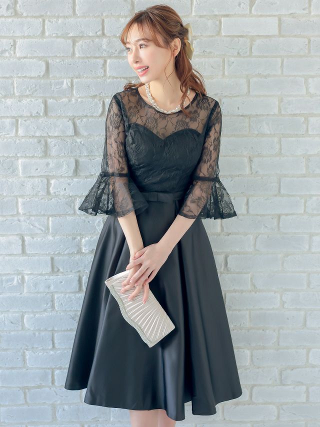 フラワー レース ウエストリボン切替 サテン スカート ミモレ丈 ベルスリーブ 結婚式 パーティー ドレス myMinette マイミネット レース切替アンブレラスリーブサテンAライン結婚式パーティードレス