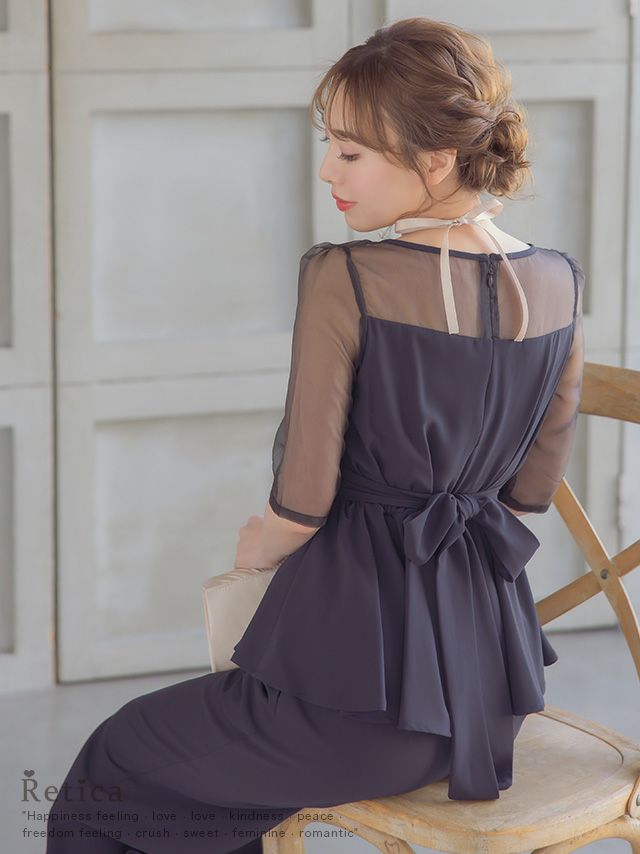 結婚式 お呼ばれ パーティー myMinette マイミネット バックリボンシアーショルダースリーブパンツ結婚式パーティードレス
