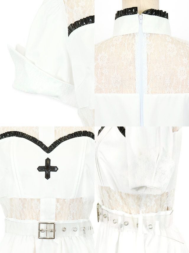 4. コスプレ セクシーパイピングレザーレースシアー体型カバーフレアスカートナース [4点セット] (ワンピース/ベルト/ナースキャップ/ヘアピン)