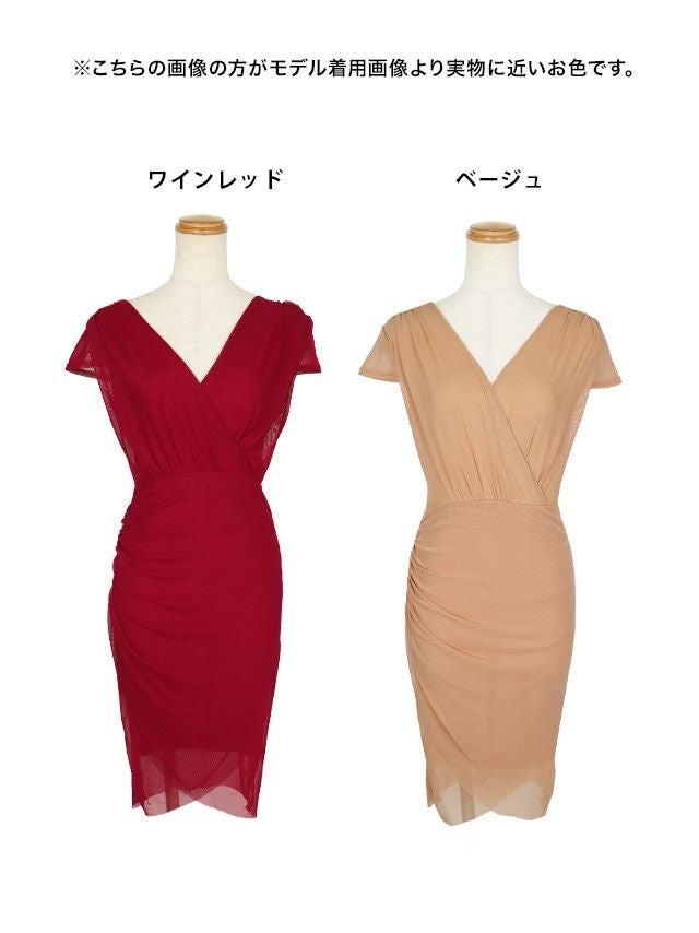 3. ミニドレス プチプラ 新人 タイト セクシー ラウンジ 半袖 シアー 低身長 谷間 カシュクール風 ベージュ キャバドレス (せいせい着用/M~XLサイズ対応) | myMinette/マイミネット