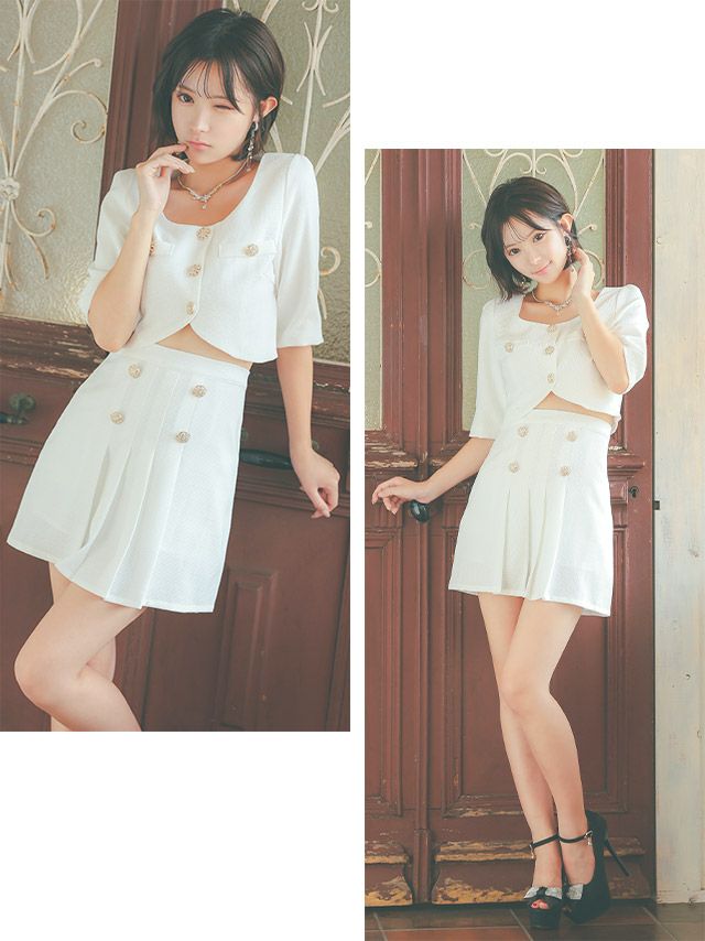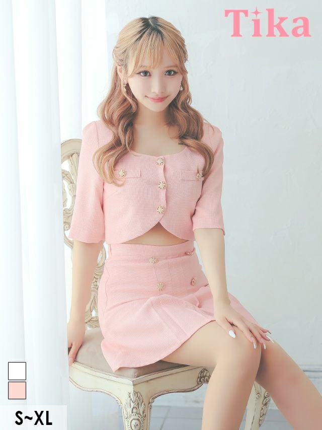 プリーツスカートでガーリーに♡ 袖ありショートトップスツイードセットアッププリーツダブルボタンフレアミニドレス (Sサイズ~XLサイズ) (聖菜/キャバドレス着用) [Tika/ティカ]