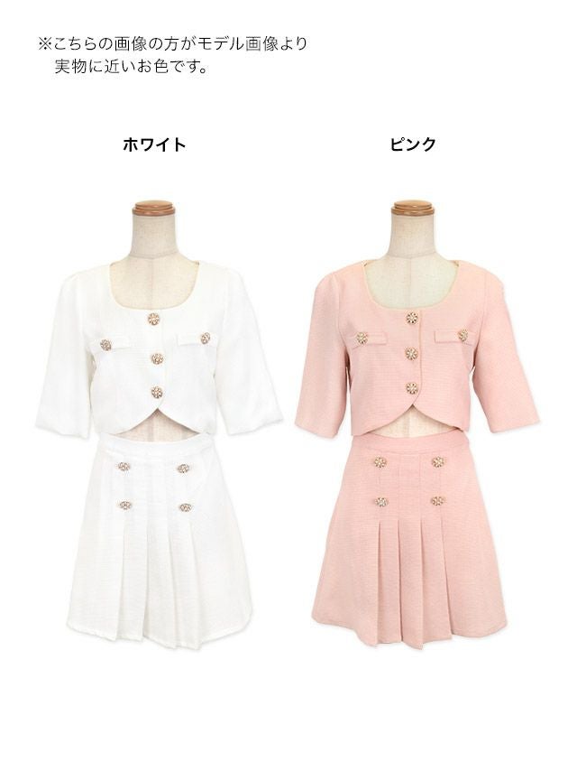 袖ありショートトップスツイードセットアッププリーツダブルボタンフレアミニドレスのディティール