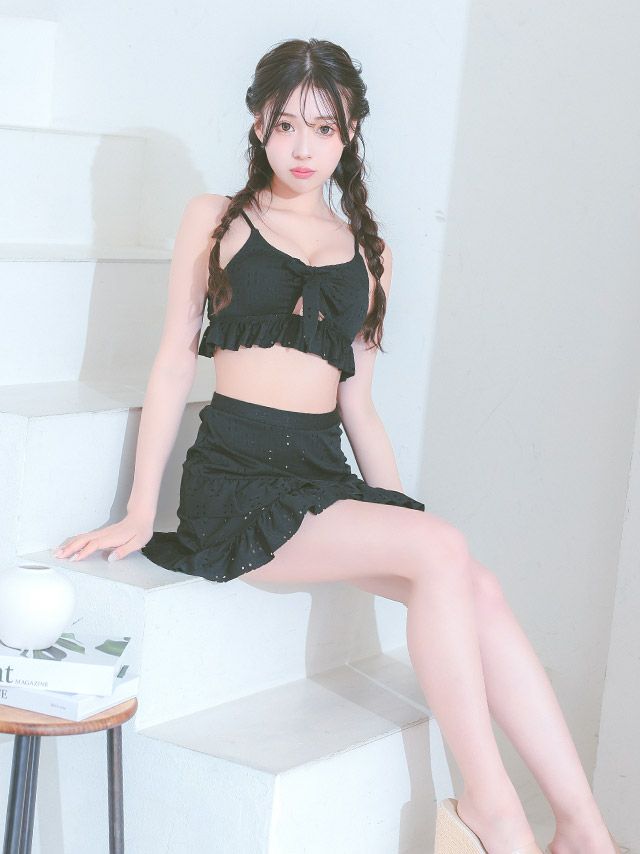 水着 エンブロイダリー レース カットアウト リボン ビスチェ 体型カバー フリル ラップスカート 韓国風 ガーリー タンキニ