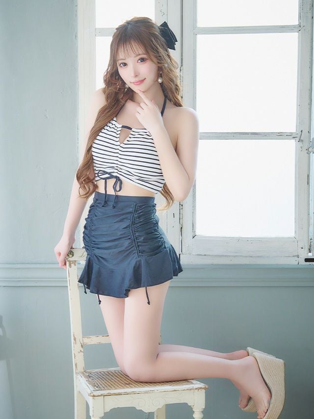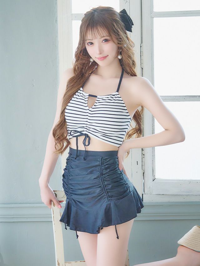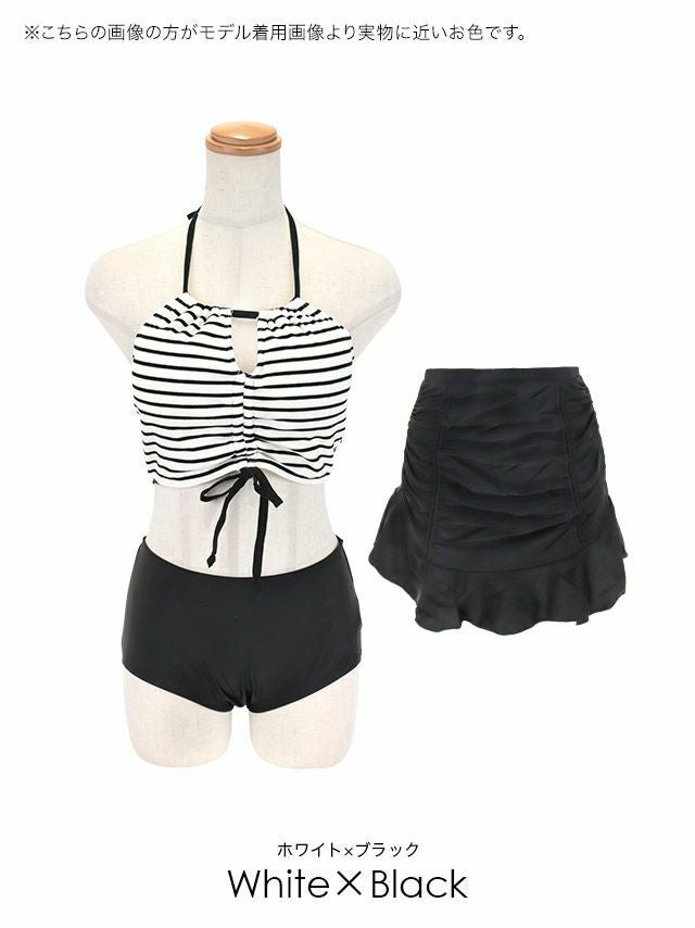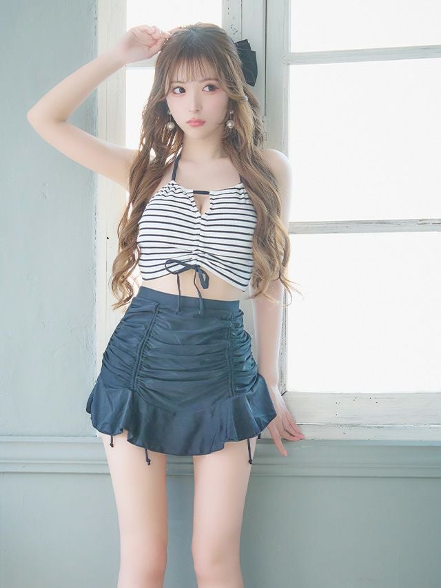 4. 水着 ガーリードロストデザインボーダービスチェ×体型カバーフレアフリルスカートホルターネックビキニ