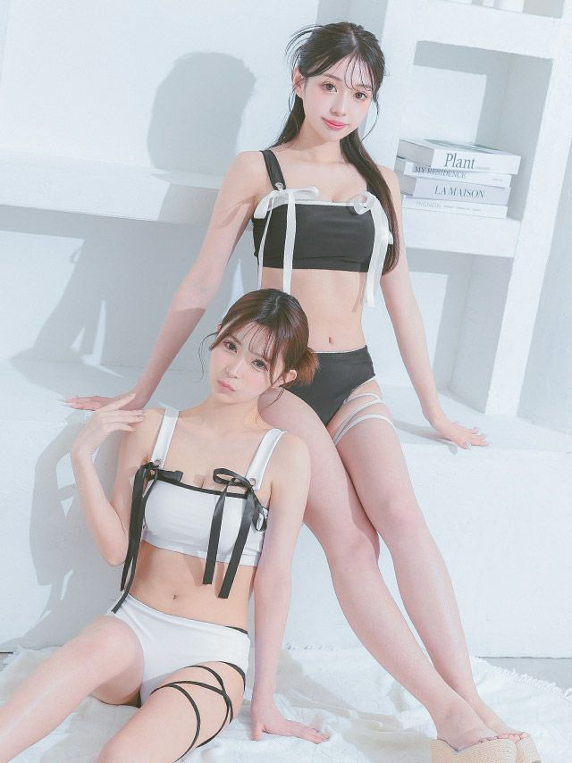 4. 水着 クロスストラップ サテンリボンパイピング ビスチェ ギャル ビキニ (ホワイト/聖菜着用)(ブラック/雨宮由乙花着用)