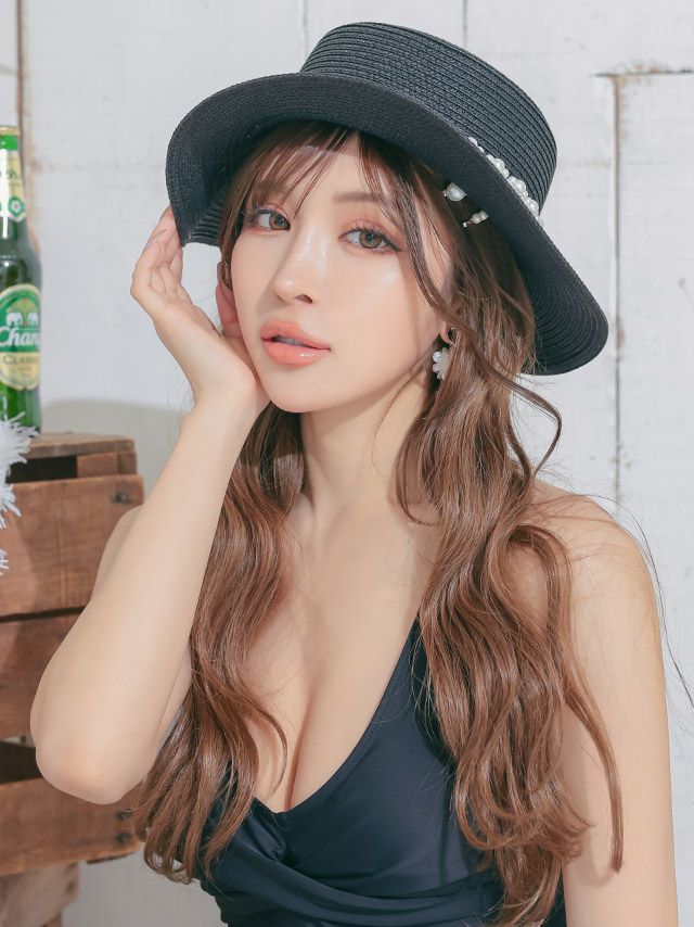 水着小物 パール付きブラックストローハット
