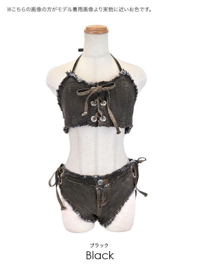 3. [新作] プチプラ 水着 デニム ホルターネック クロス リボン ハイレグ バンドゥ ビキニ