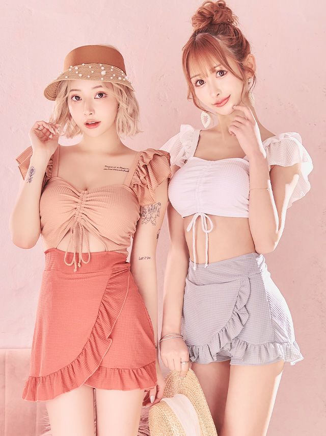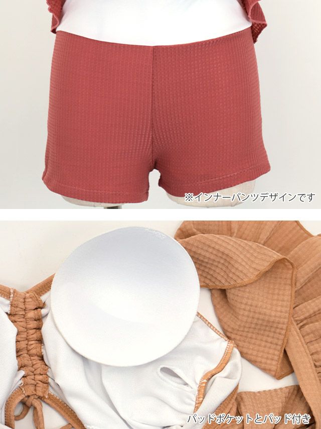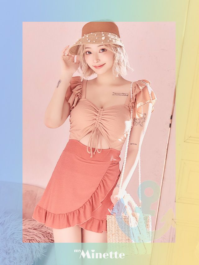 4. 水着 ワンピースウエストカットアウトフレアスカートガーリー体型カバーフリルビキニ