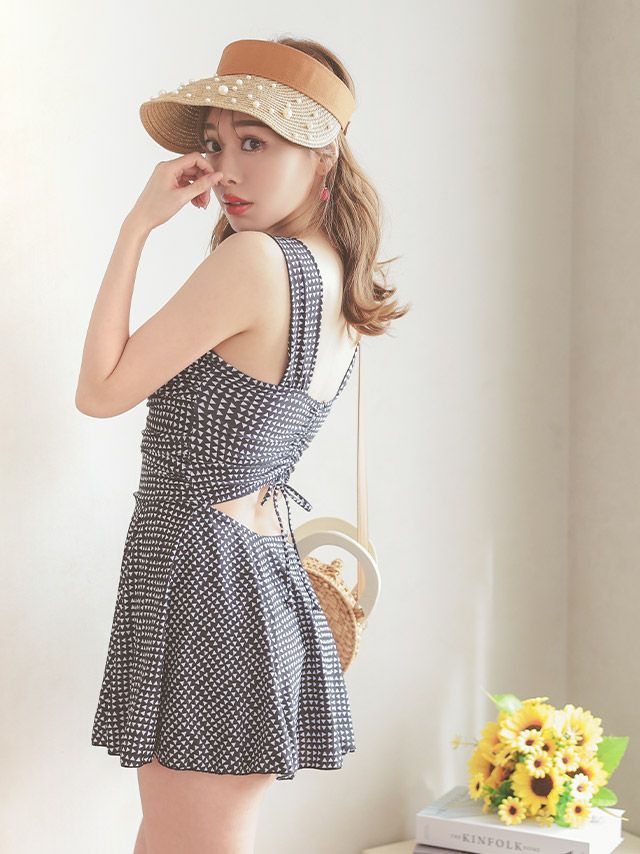 水着 モノトーンドロスカットガーリートライアングル模様体型カバーワンピースビキニ