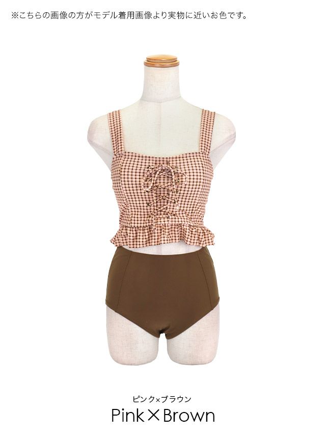 5. 水着 ガーリーチェック ビスチェ レースアップ フリル 体型カバー 韓国風 ハイウエスト ビキニ (ピンク×ブラウン/若林萌々着用)
