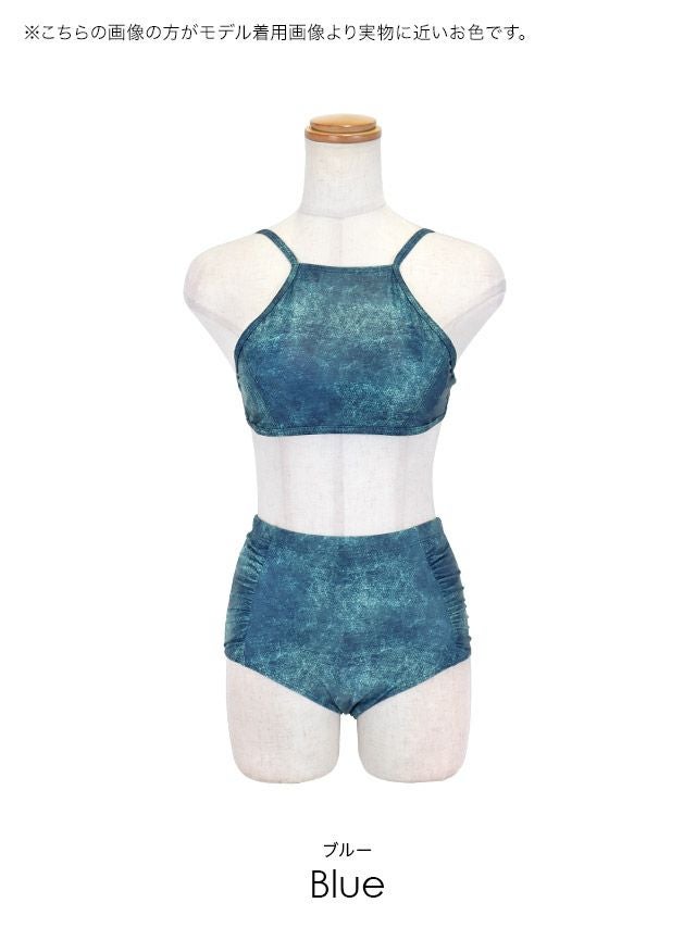 スポーティーな印象☆ 水着 ストレッチ デニム アメリカンスリーブ ハイウエスト ギャル ビキニ (ブルー/MIYABI着用)