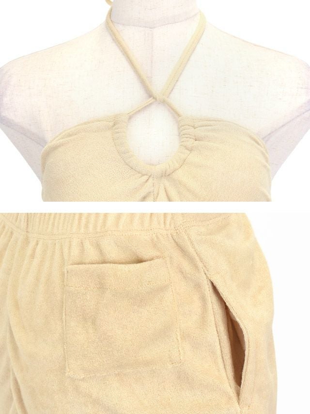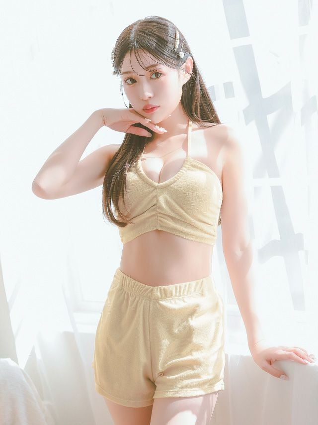 気になる下半身もさりげなくカバー◎ 水着 バンドゥ ホルターネック 体型カバー パイル ハイウエスト ショートパンツ 韓国風 タンキニ (ベージュ/雨宮由乙花) (レッド/聖菜)