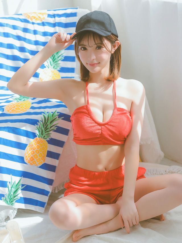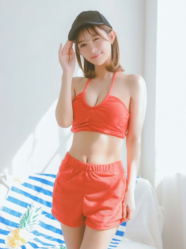 5. 水着 バンドゥ ホルターネック 体型カバー パイル ハイウエスト ショートパンツ 韓国風 タンキニ (ベージュ/雨宮由乙花) (レッド/聖菜)