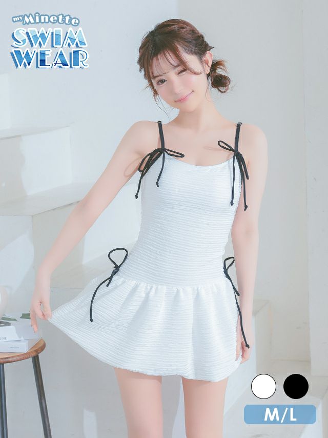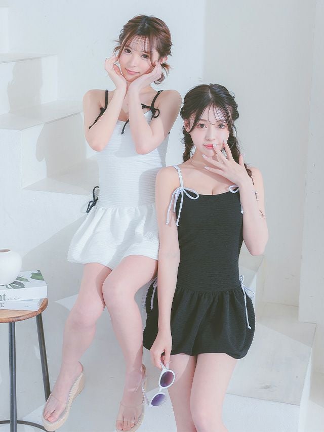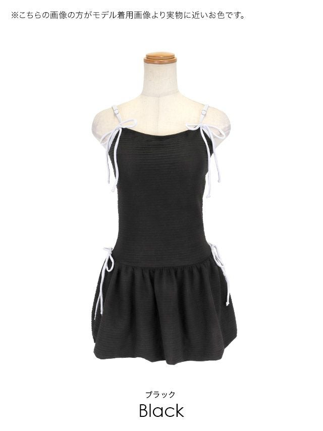 5. 水着 バイカラーリボン 韓国風 体型カバー ガーリー ワンピースビキニ (ブラック/雨宮由乙花着用)