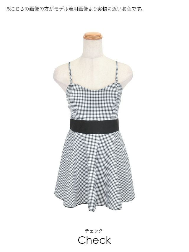 水着 ガーリーモノトーンチェック体型カバーウエストラインワンピースビキニ