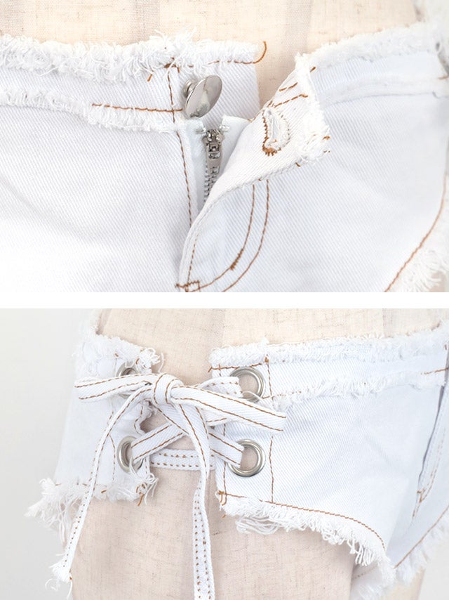 ボタン風ディテールやサイド紐で遊び心をプラスし、サイズ調整も◎