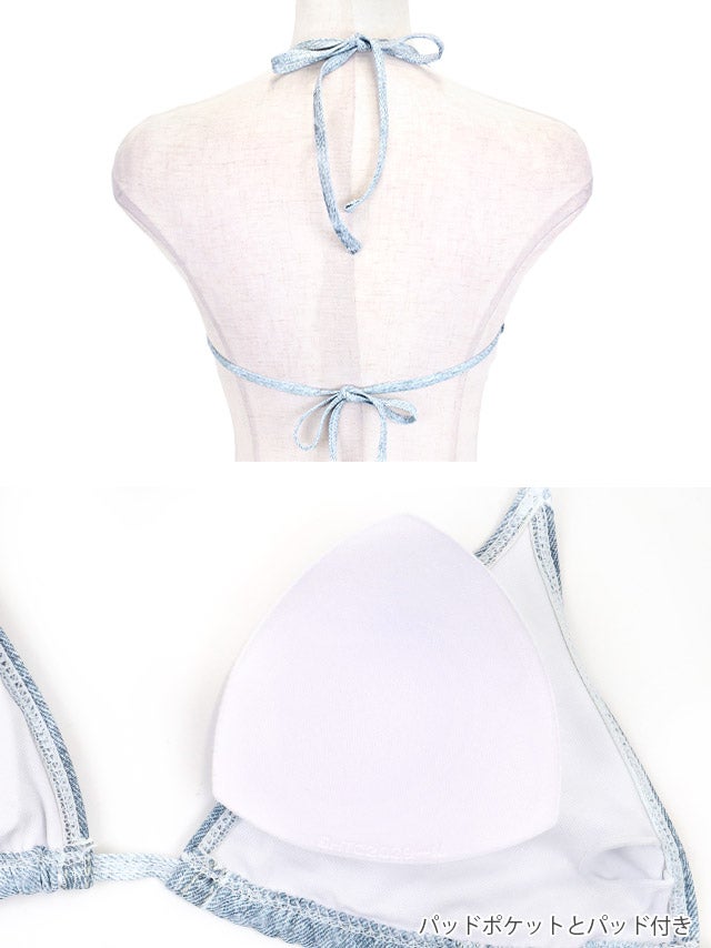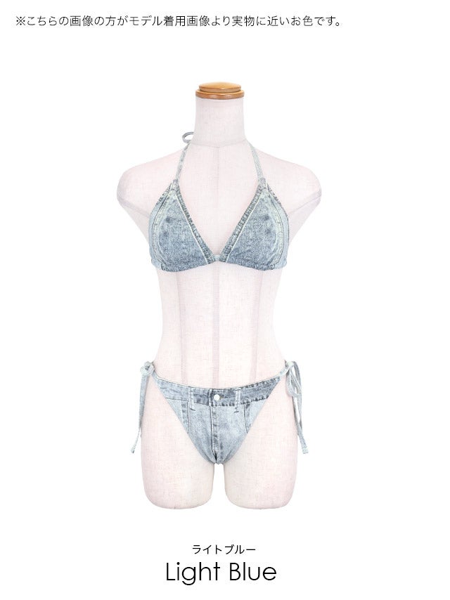 3. [新作] [セール] 水着 プチプラ 2点セット ギャル ホルターネック 三角ビキニ 紐ビキニ カジュアル シンプル デニム 青 ブルベ (みのり着用/Mサイズ着用) | myMinette/マイミネット