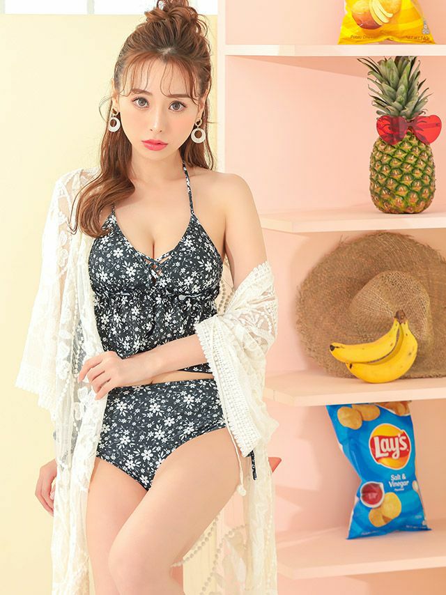 寄せ上げホルターネックとチラッと除く谷間の編み上げが