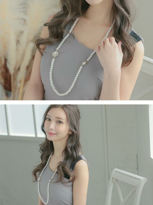5. フラワーモチーフビジューホワイトパールロングバースデーネックレス