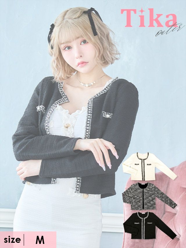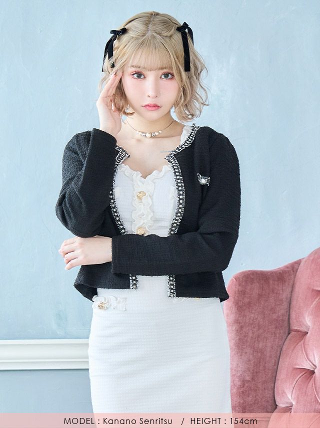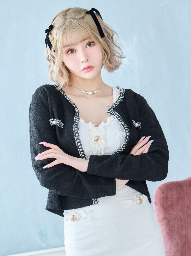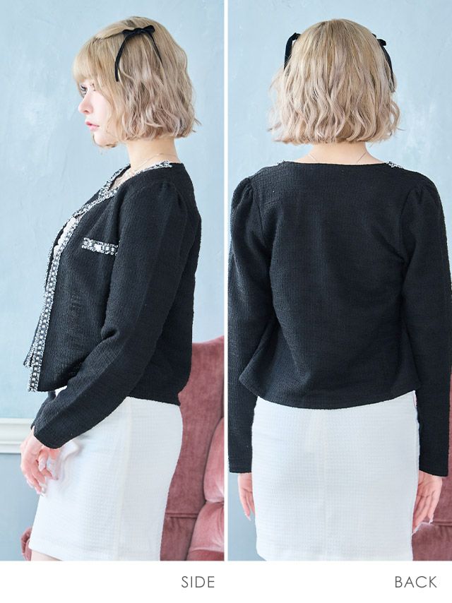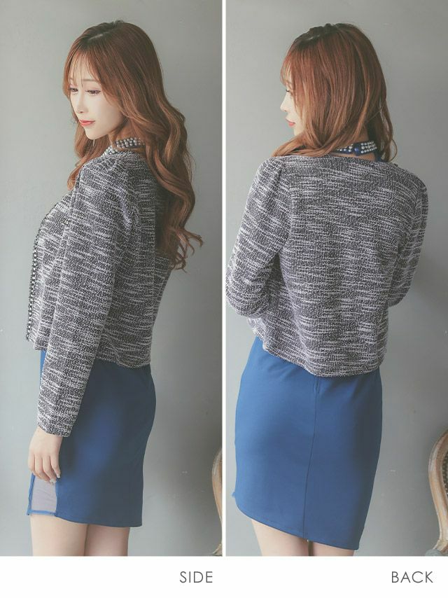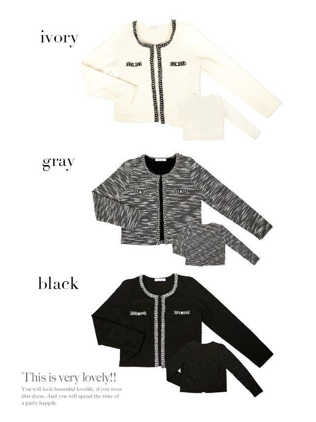 羽織りキャバクラ カーデ 体型カバー 結婚式 二次会 myMinette マイミネット フェミニン ノーカラー ニット パール ビジュー カーディガン