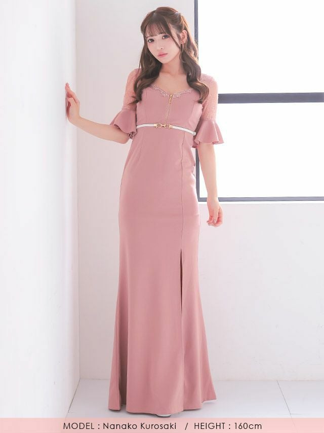 4. タイト ロングドレス 谷間 レース 大人 スリット ストレッチ 五部袖 ウエストベルト付き ジップ ベルスリーブ ブラジャーのまま キャバドレス (黒嵜菜々子着用) [Tika/ティカ]