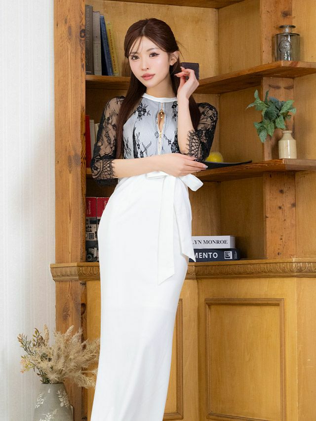 4. タイト ロングドレス 谷間 大きいサイズ レース 大人 スリット 背中魅せ ハイネック ストレッチ 袖あり 七分袖 ジップ シアー ウエストリボン キャバドレス (MIYABI着用) [Tika/ティカ]