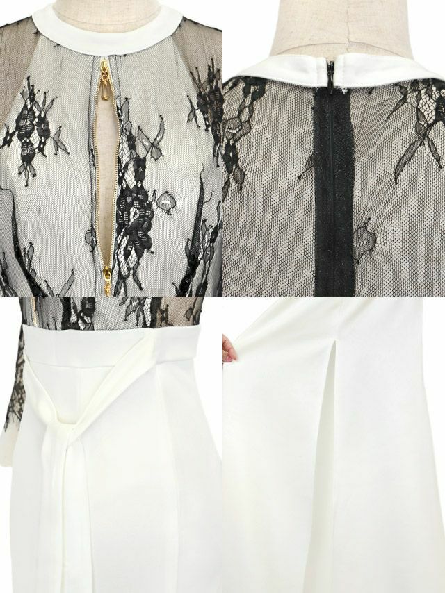 タイトロングドレス谷間大きいサイズレース大人スリット背中魅せハイネックストレッチ袖あり七分袖ジップシアーウエストリボンキャバドレス
