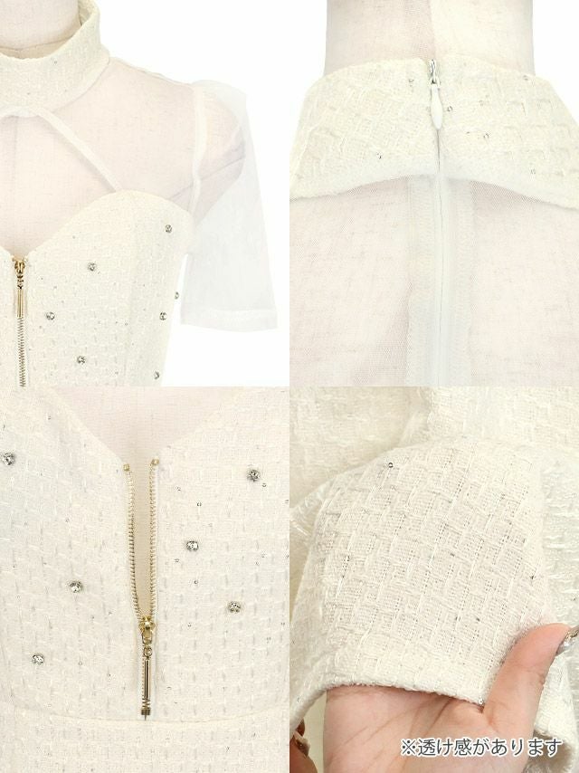 ミニドレスタイト半袖シアーハイネックバストカットジップ谷間ツイードストーンホワイトXLキャバドレスのディティール1枚目