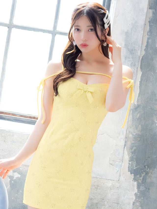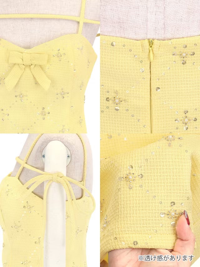 5. [新作] ミニドレス キャミソール コード リボン 谷間 フラワービジュー キラキラ ツイード タイト イエロー キャバドレス (黒嵜菜々子着用) [tk-md10977a] [Tika/ティカ]