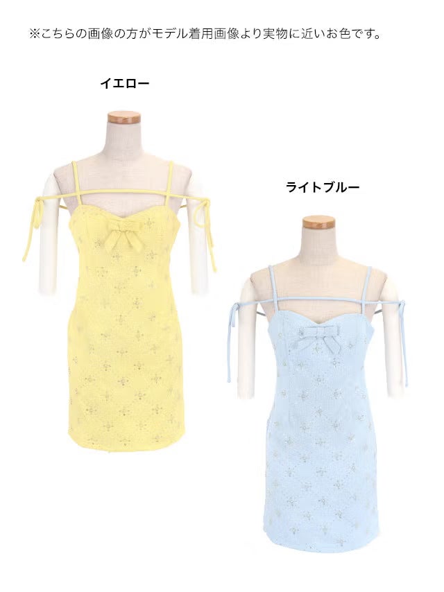 パステルカラーで華やかに演出♡ [新作] ミニドレス キャミソール コード リボン 谷間 フラワービジュー キラキラ ツイード タイト イエロー キャバドレス (黒嵜菜々子着用) [tk-md10977a] [Tika/ティカ]