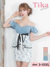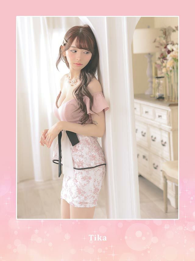 5. オフショルダーフリル袖ウエストリボンフラワーレースペプラムタイトミニドレス (Sサイズ~XXXLサイズ) (黒崎みさ/キャバドレス着用) [Tika/ティカ]