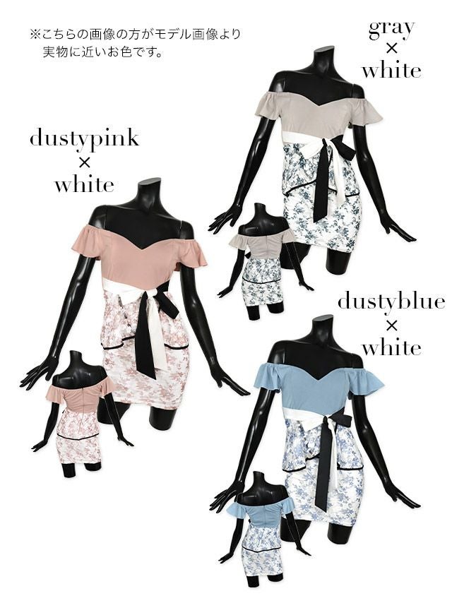 オフショルダーフリル袖ウエストリボンフラワーレースペプラムタイトミニドレスのカラー