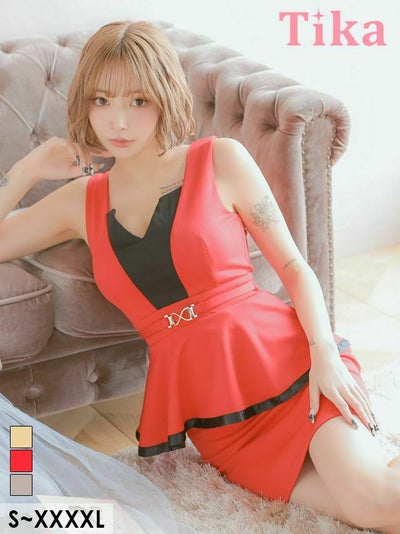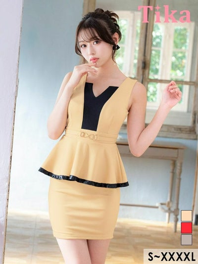 ヘルシーな肌見せを叶える♪ タイト ミニドレス 大きいサイズ シンプル 上品 ノースリーブ 大人 Vカットネック ウエストベルト ペプラム ブラジャーのまま (りせり着用) [Tika/ティカ]