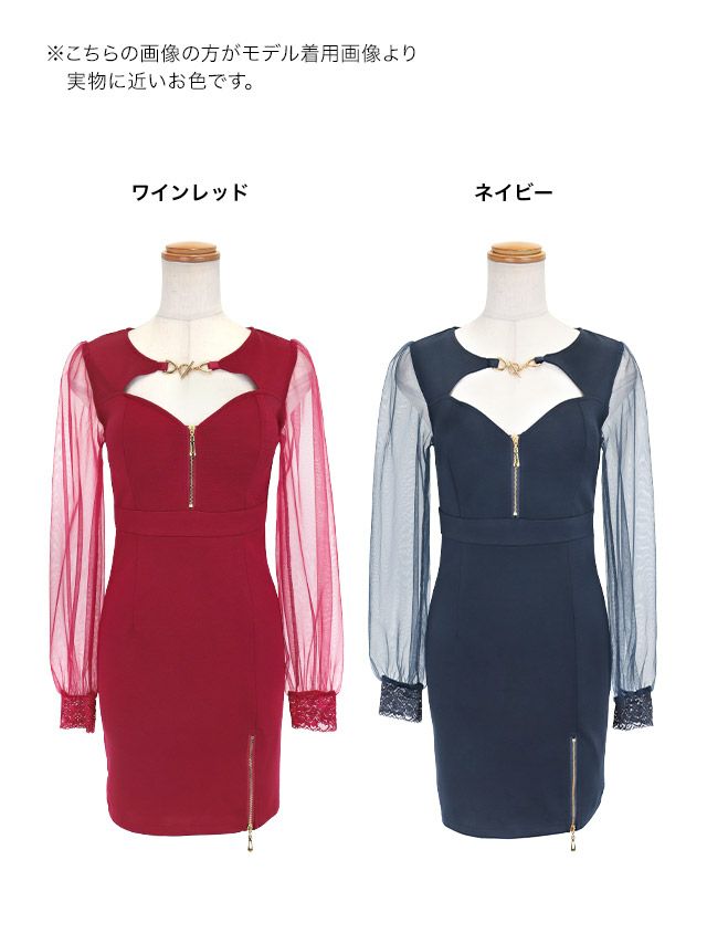 タイトミニドレス長袖谷間大きいサイズストレッチジップパフスリーブシアースリーブハートカットワンカラーキャバドレス