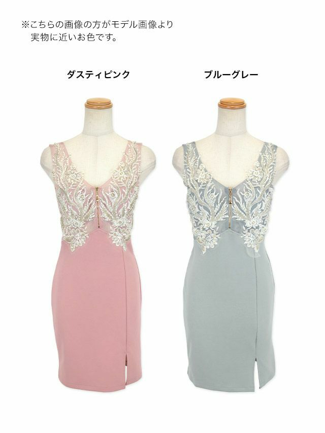 Vネックビジュー刺繍シアー切替フロントジップノースリーブ背中魅せタイトミニドレスのカラー
