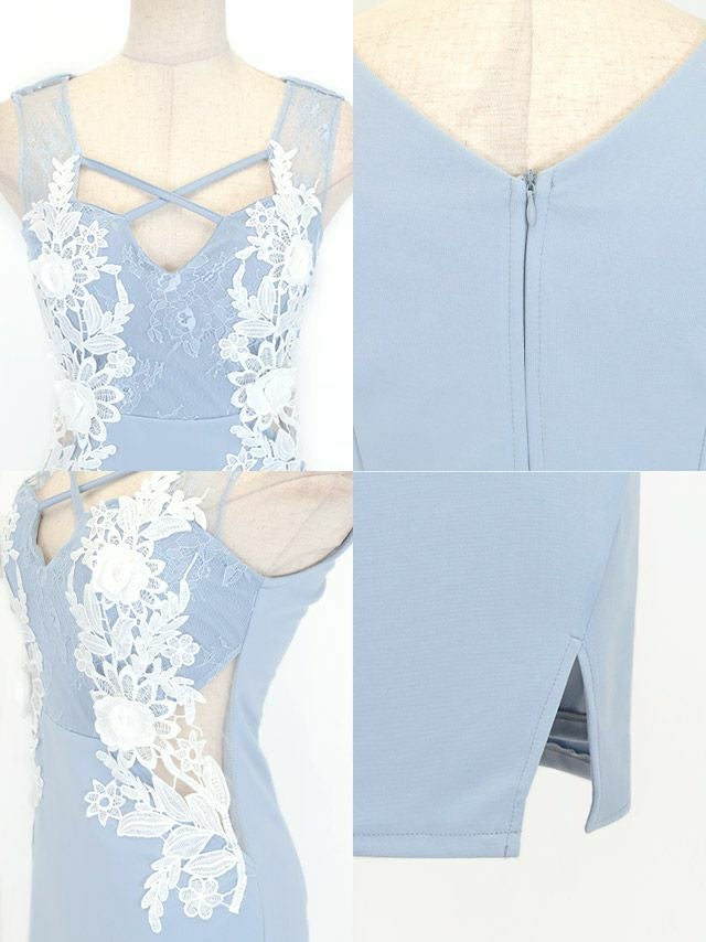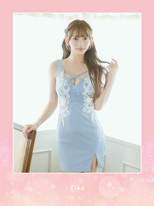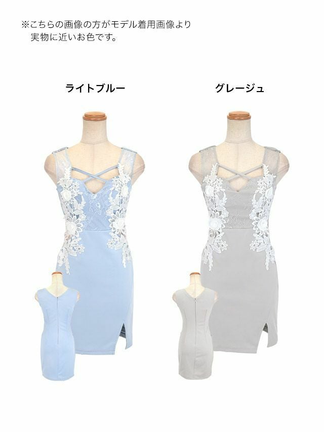 5. ノースリーブ デコルテクロス バストコード フラワー刺繍 シアーくびれ 谷間魅せ タイトミニドレス (Sサイズ~Lサイズ) (黒崎みさ/キャバドレス着用)