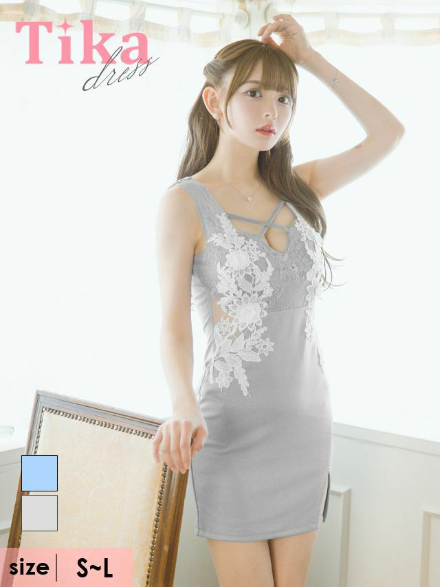 キャバドレス 安い 激安 ミニ丈 キャバクラ クラブ ラウンジ 【ノースリーブ デコルテクロス バストコード フラワー刺繍 シアーくびれ 谷間魅せ タイトミニドレス (Sサイズ~Lサイズ) (黒崎みさ/キャバドレス着用)】 プチプラドレス