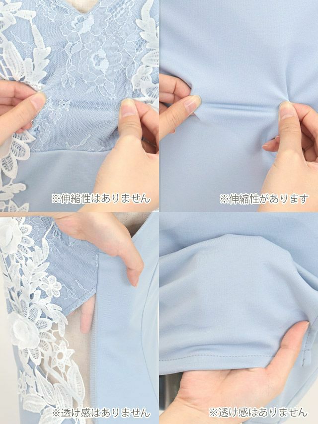 バックスリットあり フラワーレース フリル袖 バストジップ バック入り ストレッチ タイトロングドレスのディティール