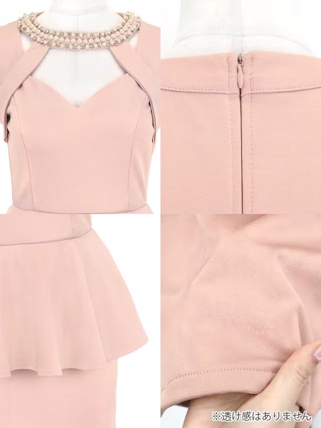 ミニドレス ペプラム 谷間 バストカット ストレッチ ノースリーブ ネックパール お腹カバー 下着のまま 大きいサイズ XL XXL 4L 5L ベージュ タイト キャバドレス のディティール画像