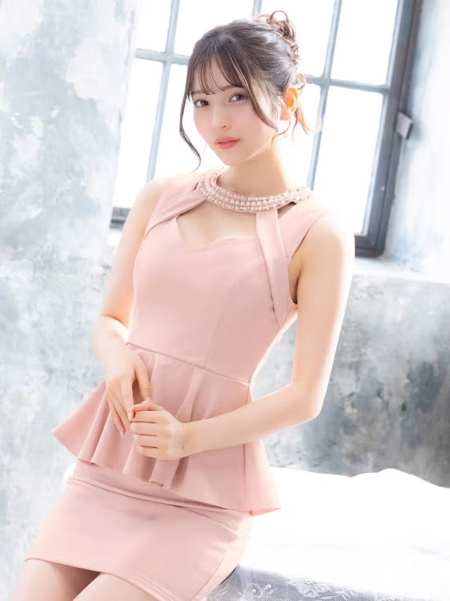 5. [新作] ミニドレス ペプラム 谷間 バストカット ストレッチ ノースリーブ ネックパール お腹カバー 下着のまま 大きいサイズ XL XXL 4L 5L ピンク タイト キャバドレス (黒嵜菜々子着用) [tk-md25123-ha] [Tika/ティカ]