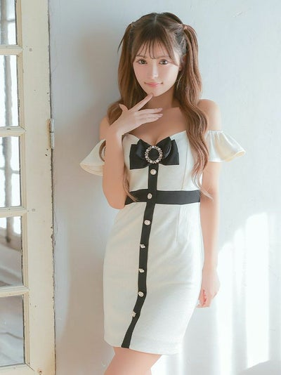 着痩せを計算されたお洒落ドレス♪ [アウトレット] 肩あきパイピングフロントボタンタイトミニドレス (Sサイズ~XLサイズ) (聖菜 PyunA./キャバドレス着用)