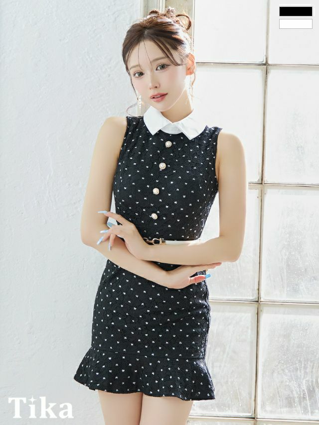 5. [アウトレット]ウエストベルト付き ノースリーブ 襟付き 総レース ドット柄 ラメ 裾フリル タイトミニドレス (Sサイズ~Lサイズ) (森脇梨々夏/キャバドレス着用) [Tika/ティカ]