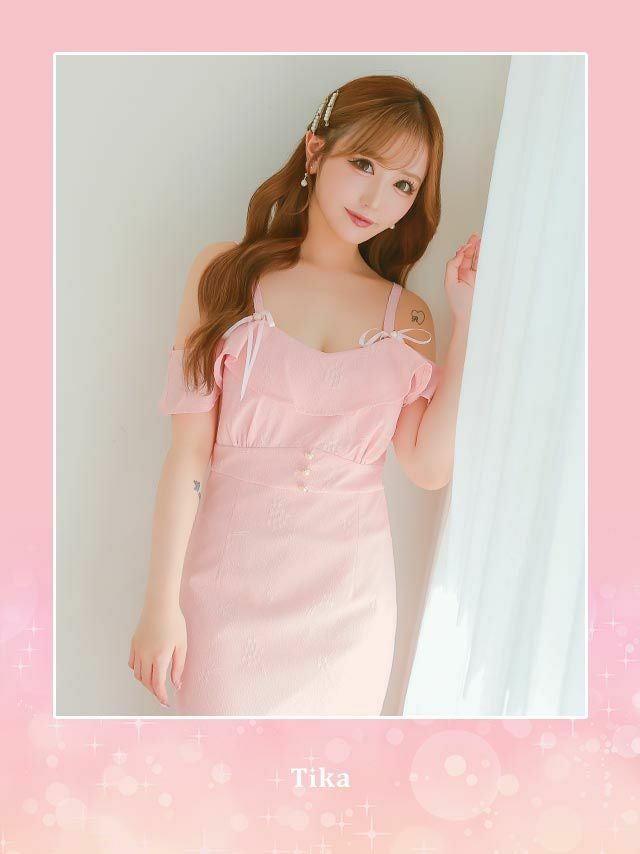 3. [アウトレット] リボンブローチ付き肩あき胸元フリルウエストパールボタンタイトミニドレス (Sサイズ~XLサイズ) (りせり/キャバドレス着用)