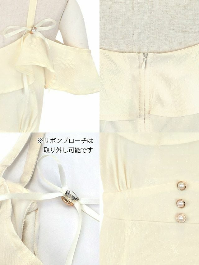 リボンブローチ付き肩あき胸元フリルウエストパールボタンタイトミニドレスの商品画像2枚目