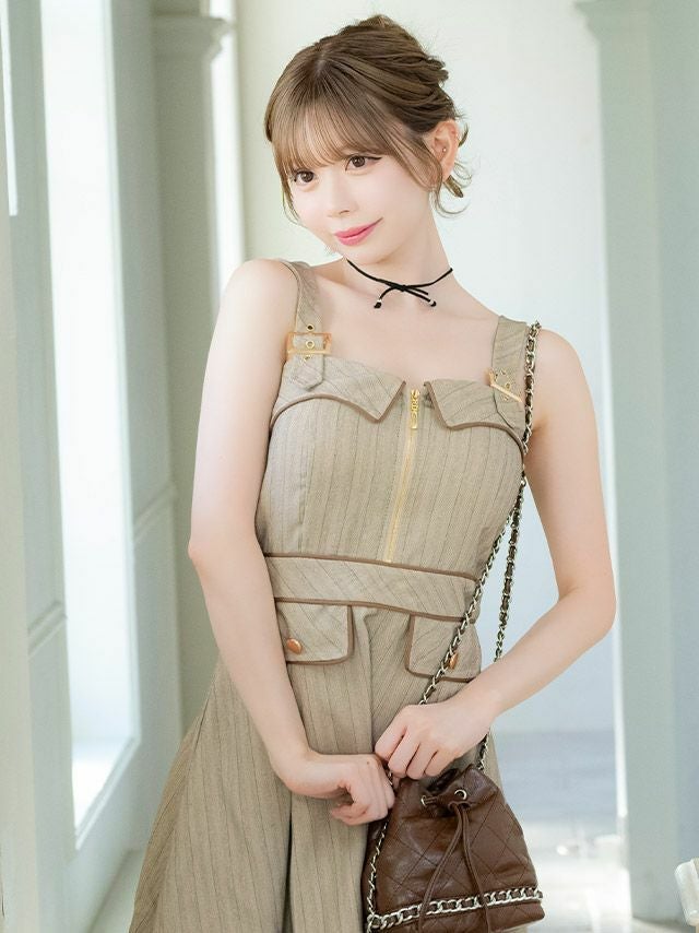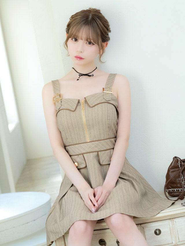 クラシカルで可愛いワンピース♡ [新作] ミニドレス Aライン キャミソール ワンピース 同伴 ジップ 谷間 ストライプ パイピング ベージュ XL キャバドレス (若林萌々着用) [tk-md271302] [Tika/ティカ]